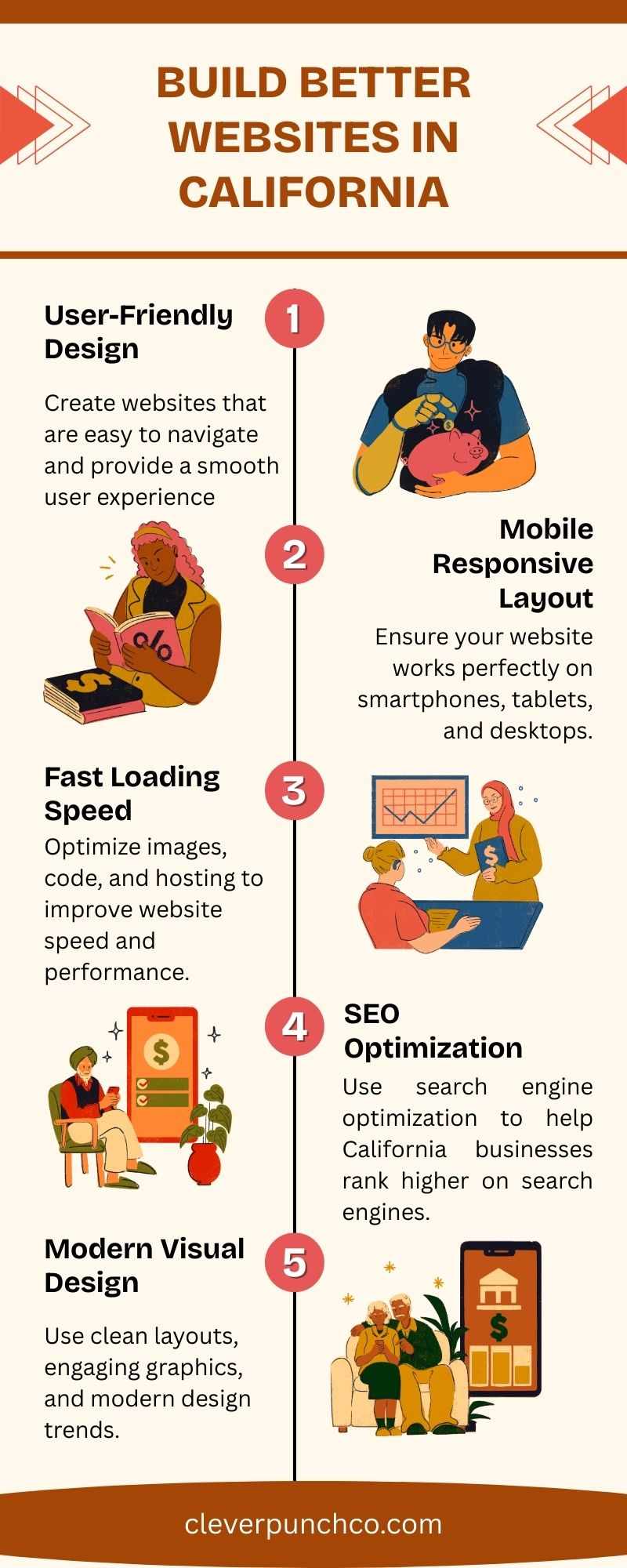 The infographic presents five essential components which businesses in California should follow to create their websites better. The design requires user-friendly elements which should work on mobile devices and load quickly while the website needs search engine optimization and current visual design. The principles of this system assist businesses to develop websites which engage users and provide accessible content while delivering high performance and better search engine results.